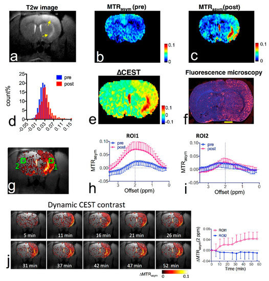 - Zhang, X.-Y.; Wang, F.; Afzal, A.; Xu, J.; Gore, J.C.; Gochberg, D.F.; Zu, Z. A new NOE-mediated MT signal at around−1.6 ppm for detecting ischemic stroke in rat brain. Magn. Reson. Imaging 2016, 34, 1100–1106. [Google Scholar] [CrossRef]