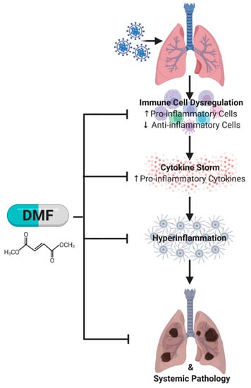 Marked by immune dysregulation, hyperinflammation and oxidative stress, severe cases of COVID-19 may benefit from the immunomodulatory, anti-inflammatory and anti-oxidative properties of DMF. However, caution must be taken—the immunosuppressive effect of DMF may be counterproductive to mounting the host anti-viral immune response in the early stages of COVID-19 and, therefore, may expediate virulence. Thus, DMF may only be suitable for severe, progressed cases of COVID-19.