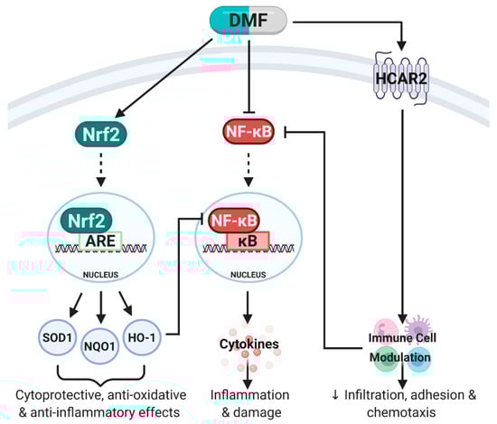 Simplified schematic of pathways activated by dimethyl fumarate (DMF). DMF is known to mediate its anti-inflammatory, anti-oxidative and immunomodulatory effects primarily through three molecular pathways: (1) Activation of nuclear factor erythroid 2-related factor 2 (Nrf2) which binds to the antioxidant response element (ARE) in the nucleus to stimulate transcription of Phase II enzymes including superoxide dismutase (SOD1), NAD(P)H quinone oxidoreductase-1 (NQO1) and heme oxygenase-1 (HO-1). Together, SOD1, NQO1 and HO-1 mediate cytoprotective, anti-oxidative and anti-inflammatory effects. (2) DMF can directly inhibit nuclear factor kappa B (NF-κB), which prevents the translocation of NF-κB into the nucleus, binding to the κB site, release of pro-inflammatory cytokines and subsequent inflammation and damage. DMF can also indirectly inhibit NF-κB through HO-1 expression and immune cell modulation through hydroxycarboxylic acid receptor 2 (HCAR2) activation. (3) DMF’s immunomodulatory effects are predominantly mediated through HCAR2 activation which modulates immune cell populations (pro-inflammatory to anti-inflammatory shift) and inhibits NF-κB. Adapted from []. Created with BioRender.com.