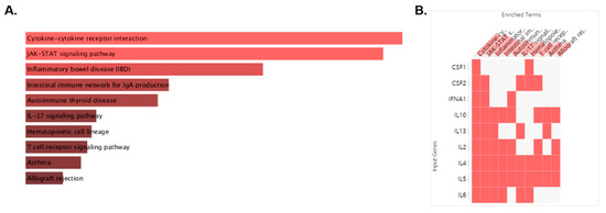 Among the modules, M2 is cytokine–cytokine receptor interaction, which is closely related to the targets affecting asthma. With 10 targets of M2 including IL2, IL4, IFNA1, IL13, CSF2, IL6, IL5, IL10, CSF1, and GUCA2A, we conducted pathway analysis, which was visualized as bar graph, table and clustergram sorted by p value. We found that the first cluster of M2 was cytokine–cytokine receptor interaction and the second that was JAK-STAT signaling pathway (Figure 2A; Table 2). For Cytokine–cytokine receptor interaction, CSF1, CSF2, IFNA1, IL-10, IL-13, IL-2, IL-4, IL-5, and IL-6 were related. For JAK-STAT signaling pathway, targets for cytokine–cytokine receptor interaction except CSF1 were related (Figure 2B). For this, we could find that the target of M2 affecting asthma were cytokine activation and JAK-STAT signaling pathway among the targets of MEO.