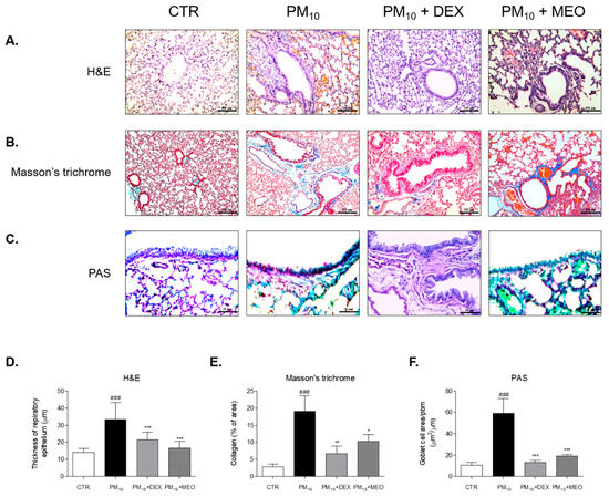 The thickness of epithelial cells in the lung tissues of the PM10 group was 2.3 times higher than that of the control (CTR) group. The administration of dexamethasone (DEX) to the PM10-challanged mice significantly reduced the thickness of epithelium of lung. Airway wall thickening by PM10 exposure was attenuated by MEO treatment (Figure 3A). There were 35.3% and 50.3% decreases in epithelial thickness in DEX and MEO-aerosolized mice, respectively, compared to PM10-exposed mice (Figure 3D). Collagen deposition was increased in the lungs of the PM10 group than in the CTR group. Nebulizing with DEX and MEO exhibited reduction of blue-stained collagen area in lung tissues (Figure 3B). While DEX treatment showed 64.7% decrease of collagen deposition, treatment of MEO by nebulizing in PM10-exposed mice significantly attenuated that by 46.3% (Figure 3E). In addition, the number of goblet cells was 5 times elevated in the lungs of the PM10 group than in the CTR group, which was reduced by administration of DEX. We observed that increased goblet cells were markedly suppressed by MEO aerosolization (Figure 3C). The reduction rate of MEO on goblet cells area/ppm was 67.8% (Figure 3F).