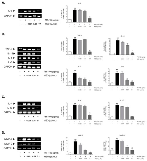 PM10 exposure to A549 lung cancer cells induced elevation of inflammatory cytokines mRNA levels. Sensitization of PM10 significantly elevated the 4.4-fold level of IL-6 in comparison with the non-treated cells. Increased IL-6 level by PM10 was significantly decreased by 68.5% in 10−3 /mL (v/v %) of MEO-treated cells (Figure 4A). After PM10 exposure for 24 h, mRNA expression of the pro-inflammatory cytokines including TNF-α (5.5-fold) and IL-1β (8.8-fold) were increased in A549 lung cancer cells. Treatment of 10−3 /mL (v/v %) of MEO significantly reduced the expressions of TNF-α and IL-1β by 81.9% and 85.8%, respectively, in PM10-exposed cells. Similar effects were shown in the results of IL-5 and IL-8 mRNA expressions. PM10-induced increase of IL-5 level was reduced by 10−3 /mL (v/v %) of MEO treatment. Moreover, there were about 58.9% and 70.4% decreases of IL-8 expressions in MEO 10−4 and 10−3 /mL (v/v %)-treated cells (Figure 4B). In addition, Th2-specific cytokines, IL-4 and IL-13, were elevated 4.4 and 6.1 times by PM10 sensitization compared to non-treated cells. The mRNA level of IL-4 in MEO 10−4 /mL (v/v %)-treated cells was lower than only PM10-exposed cells. IL-13 expressions were significantly altered by both 10−4 and 10−3 /mL (v/v %) of MEO-treated cells (Figure 4C).