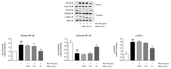 PM10-treated A549 cells exhibited the increase of NF-κB levels in nucleus as well as phosphorylation of IκB-α in cytosol compared to non-treated cells. Increase rates of nucleic NF-κB and phosphorylated IκB-α compared with non-treated cells were 1.8 and 3.0 times. Whereas the expression of NF-κB in cytosol was markedly decreased under exposure of PM10 by about 70%. Treatment with 10−3 /mL (v/v %) of MEO significantly down-regulated the NF-κB levels by 41.1% in nucleus, while up-regulated that by 94.4% in cytoplasm. In addition, the phosphorylated IκB-α in cytosol in the MEO-treated cells was 34.4% lower than the only PM10-treated cells (Figure 6).