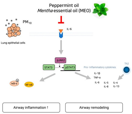 Given that inflammation and the JAK/STAT3 signaling pathway are potential mechanisms associated with PM10, we hypothesized that inhalation of the essential oil derived from the Mentha genus, peppermint oil, could inhibit the epithelial remodeling and inflammation in asthma via regulation of IL-6/JAK2/STAT3 signaling pathway according to the network pharmacological analysis. Our results found that PM10-induced IL-6 production and JAK2/STAT3 phosphorylation were declined by the MEO treatment, accompanying a decrease in inflammatory responses including cytokines, MMP activation and NF-κB translocation (Figure 7). Consequently, aerosolization of peppermint oil by a nebulizer markedly ameliorated the airway epithelium damage against PM10 such as epithelial remodeling, collagen deposition, and goblet cell hyperactivation in asthma. These findings provide a potential property of MEO for the respiratory system in response to air pollution exposure. Peppermint oil would help to alleviate asthma by inhibiting the IL-6/JAK2/STAT3 pathway.