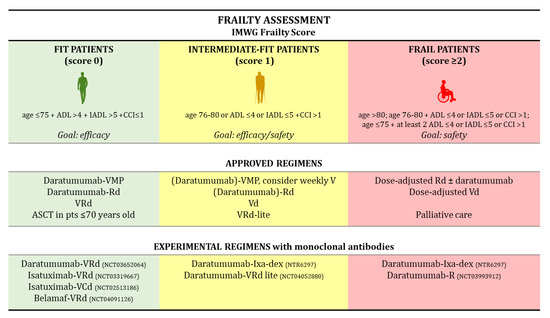 Despite the growing range of treatment options, elderly NTE patients represent a heterogeneous population, including fit patients who are able to tolerate full-dose triplets/quadruplets and frail patients requiring tailored approaches with less toxic combinations [17,18,19]. New mAb-based treatment combinations are being explored also in these subsets of patients.