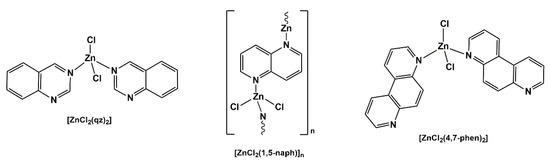 - Yamgar, R.S.; Nivid, Y.; Nalawade, S.; Mandewale, M.; Atram, R.G.; Sawant, S.S. Novel zinc(II) complexes of heterocyclic ligands as antimicrobial agents: Synthesis, characterisation, and antimicrobial studies. Bioinorg. Chem. Appl. 2014, 2014, 276598. [Google Scholar] [CrossRef]