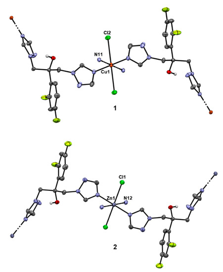 - Pan, G.-H.; Tang, J.-N.; Xu, S.-H.; Huang, Z.-J.; Mo, B.-F. Poly[[μ-chlorido-μ-[2-(2,4-difluorophenyl)-1,3-bis(1,2,4-triazol-1-yl)propan-2-ol-κ2N4:N4′]-zinc] chloride dihydrate]. Acta Cryst. E 2013, 69, m573. [Google Scholar] [CrossRef] [PubMed]