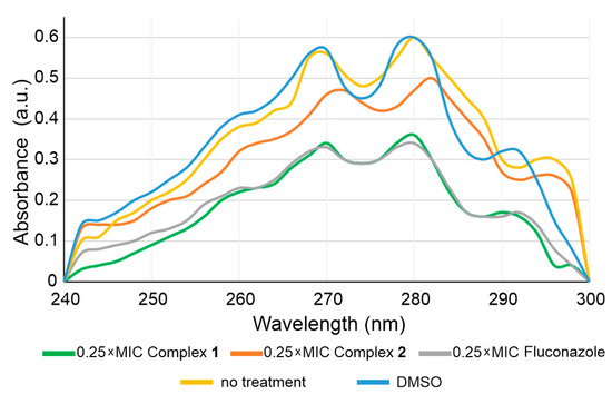 2.2.2. Ergosterol Biosynthesis in C. albicans Treated with Fluconazole and Complexes 1 and 2