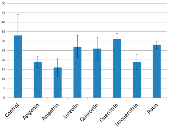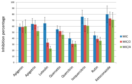 The best antifungal potential among the tested compounds could be observed for luteolin, quercitrin, isoquercitrin, and rutin (minimum inhibitory concentration (MIC) 37.5 µg/mL) (Table 1). Apigenin and apigetrin were the subject of a previous study by our group [12], and additional insight into their anticandidal activities has been enlightened within this study. Previously published active concentrations of apigenin (MIC 100 µg/mL) and apigetrin (MIC 50 µg/mL) towards the strain C. albicans 475/15 [12] were used in further experiments.
