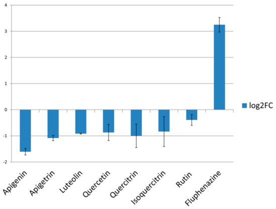 Treatment of C. albicans cells with selected flavonoids led to a more-or-less significant reduction of CDR1 expression levels. Apigenin and apigetrin exhibited the most prominent impact on lowering CDR1 levels (log2FC < −1), while the effect of other flavonoids was less profound (Figure 3).