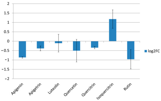 Treatment with isoquercitrin has up-regulated expression of ERG11 in C. albicans cells (Log2FC > 1), an undesirable trait of potential antifungals since their application can lead to reduced susceptibility to azole antifungals. Treatment of C. albicans with apigenin and rutin led to lower expression levels of ERG11 (Figure 4), suggesting that these compounds have potential for further development as part of novel antifungal strategies.