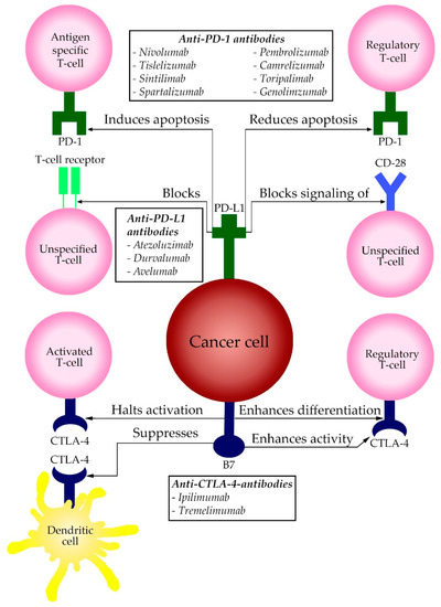At this time, the best understood mechanism is that of immune checkpoint inhibition. Tumors activate these immune checkpoints to incapacitate immune cells and their natural antitumor response. Hence, tumor growth depends on insufficient immunologic surveillance in the body. These immune checkpoints are proteins that inhibit immune cells and are vital for induction and maintaining tumor immune tolerance [16]. Since the introduction of immune checkpoint inhibitors in oncology in 2010 [17] and 2012 [18], promising results were found in a variety of cancers. Currently, inhibitors of cytotoxic T-lymphocyte-associated protein 4 (CTLA-4), programmed cell death protein 1 (PD-1) and its ligand (PD-L1) are well known and have been approved for several cancer treatments. Both CTLA-4 and PD-1 are proteins that are expressed as surface glycoproteins in T-lymphocytes. Once activated by their ligands, the T-cell activity gets inhibited and this can even lead to T-cell apoptosis. As a consequence, their antitumor immunity that is used to kill tumorous cells is prevented. Therefore, T-cells are logical targets for anticancer treatment [19].