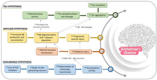 In this scenario, the medicinal chemistry efforts have been paid with a view to disclosing novel chemotypes which could include in their structures the required pharmacophoric features to target one or more of these factors implicated in AD. Many examples of NQ and AQ compounds from natural sources or synthetic have emerged in virtue of their promising properties against AD. In the present review we will focus our survey on cholinesterases, Aβ and tau proteins as main targets of NQ and AQ compounds, whose networked roles in AD etiology are detailed as follows (Figure 1).