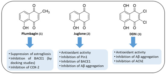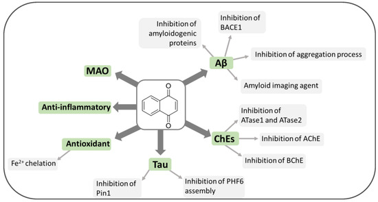 Recent studies have also shed light on the neuroprotective effects and Aβ aggregation inhibition performed by 1,4-NQs [67,68,69,70], thus suggesting the NQ scaffold as valuable chemotype for the design of AD therapeutics.