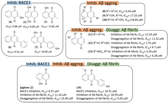 As mentioned before, natural compounds may serve to select novel core structure and molecular fragments to enrich the molecular diversity of a compound library toward an enhanced efficacy. On this wave, Bermejo-Bescós et al. in 2010 screened 26 NQ derivatives, juglone being included, for their antiamyloidogenic properties [70]. Several 1,4-NQs provided activities in the inhibition of BACE1 and Aβ aggregation, and disaggregation of Aβ fibrils (Figure 5). In particular, five compounds (2-hydroxy-1,4-naphthoquinone (4), 5,8-dihydroxy-1,4-naphthoquinone (5), plumbagin (1), 2-phenyl-1,4-naphthoquinone (6) and 5-hydroxy-2-(4-hydroxyphenyl)-1,4-naphthoquinone (7)) displayed an inhibitory selective profile on BACE1, while 2-bromo-NQs behaved selectively as inhibitors of Aβ aggregation. 1,4-Naphthoquinone (11), 6-hydroxy-1,4-naphthoquinone (12) and 5-nitro-1,4-naphthoquinone (13) were dual inhibitors of Aβ aggregation and disaggregation. Finally, juglone (2) and 3-(4-hydroxyphenyl)-5-methoxy-1,4-naphthoquinone (14), showed a promiscuous pharmacological profile against all the three targets.