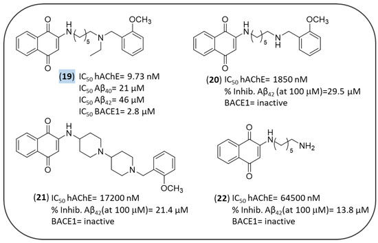 As a result of AChE inhibition study, only compound 19 proved to be effective with IC50 = 9.73 nM. The lower activity of 20 and 22 confirmed both the ethyl group and the 2-methoxybenzyl moiety as important substitutions of the terminal tertiary amine group, as previously observed in other memoquin derivatives [120,121]. Conversely, the 1,4-piperidine spacer of 21 was too rigid, thus hampering its adequate fitting into the AchE gorge. Docking simulations showed that 20 was able to interact with the hAChE catalytic site, and meantime to protrude towards the solvent-exposed gorge entrance, establishing three key interactions at hAChE active site: (i) protonated nitrogen of the ligand formed a cation−π interaction with the indole ring of Trp86 and the phenol ring of Tyr337; (ii) the oxygen in position 1 of the quinone moiety made a H-bond with the backbone of Phe295; (iii) the NQ moiety was engaged in favorable π−π stackings with the indole ring of Trp286 of the PAS. The last finding was relevant in the context of previous reports which connected the inhibition of AChE-induced Aβ aggregation to the ability of a binder to interact with the PAS of the enzyme. Hence, a direct correlation between AChE inhibition and AChE-induced aggregation was observed for 20 [122,123]. Indeed, the inhibition of self-induced Aβ aggregation by 19 was lower than 21 (22% vs. 29%, respectively) probably because compound 21 could take additional positive contacts with the biological target through its additional nitrogen atom. Compound 19 was tested in primary chicken telencephalon neurons to substantiate its secretase inhibitory activity by affecting APP processing [124]. Interestingly, 19 inhibited Aβ38, Aβ40, and Aβ42 secretion, with IC50 values of 19, 21, and 46 μM, respectively, without producing toxic effects in a concentration range of 0.01−50 μM.