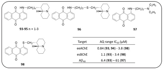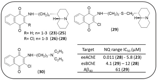 In 2015, Sparatore F. et al. described the multitarget profile of a library of thioxanthene-9-one, xanthen-9-one, NQ (Figure 8) and AQ derivatives (see Figure 18) decorated with a basic side chain of variable length (dialkylaminoalkyl and quinolizidinylalkyl chains) [125]. These molecules were tested against electric eel AChE (eeAChE) and equine serum BChE (esBChE) and the spontaneous Aβ40 aggregation. In particular, most of NQs 23–30 proved to be dual but AChE-preferring inhibitors (IC50 = 0.011–5.8 µM) over BChE, while Aβ40 aggregation was poorly inhibited (29, IC50 = 61 µM) or not affected. Regarding the influence of the polymethylene linker tethering the NQ scaffold to the basic moiety, its elongation was responsible for an increase of the ChE inhibitory potencies. However, a remarkable 37-fold decrease of AChE inhibition was observed when the trimethylene linker of 28 (IC50 = 0.011 µM) was further elongated of two units (29, IC50 = 0.41 µM). Compound 28 confirmed the same degree of activity against the human AChE (hAChE, IC50 = 0.04 µM). As lead of NQ subset, it was also investigated for its ability to cross the BBB by passive diffusion, βand to interact with P-glycoprotein (P-gp), which is involved in the efflux transport of drugs: it showed an efflux ratio (ER) equal to 0.78 comparable to that of diazepam (ER = 0.79), used as reference compound. In vitro assay for cytotoxicity against the neuroblastoma cell line SH-SY5Y revealed for compound 28 a low IC50 value of 3.6 µM, but a good selectivity ratio (toxicity/AChE inhibition) equal to 327.