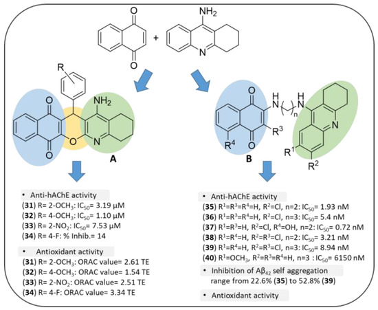QuinoPyranTacrines (QPT), by M. Chioua et al., resulted from the condensation of 1,4-NQ and tacrine motifs (31–34, Figure 9A) by means of a 4H-pyran ring, bearing at position 4 an aromatic ring variously decorated with electron-withdrawing (F, NO2) and electron-donor (OCH3) groups [131]. In the initial screening phase, all the compounds were tested for their potential hepatotoxicity, resulting non-hepatotoxic in the majority of cases. The evaluation of their inhibitory action against human ChEs allowed only three compounds to be identified as hAChE inhibitors. The 4-methoxy substituted derivative (32) was the most active, displaying IC50 = 1.10 μM, but less potent than tacrine, and inactive against BChE. The compounds were next evaluated for their antioxidant activity and shared to scavenge the peroxyl radical with ORAC (oxygen radical absorbance capacity) values in the range 1.54 (32)–3.34 (34) Trolox equivalents (TE), comparable to reference compound ferulic acid (ORAC value = 3.74 TE). In particular, the electron withdrawing groups such as R = 4-F (34) and 4-NO2 (33) were responsible for a greater antioxidant activity, while for OCH3 group the substitution at position 2 of the aromatic ring was preferred (31). Docking studies allowed the disclosure of the R-enantiomer of 32 as the best conformation to fit into the AChE cavity. Thus, compound 32 may represent an interesting starting point for the design of novel tacrine-based hybrids with enhanced efficacy and safety.