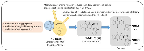 On this wave, Scherzer-Attali group designed and synthesized four derivatives of NQTrp (Figure 10) exploring the impact of configuration change (D-isomer of Trp) and of single and double-methylation of NQTrp nitrogen atoms on affecting Aβ aggregation [143]. The effects of the different substitutions and rearrangements were studied in silico as well as in vitro. The in-silico results suggested that the D-isomer and the N-methylindole derivative had a binding affinity toward Aβ oligomers comparable to NQTrp, while the N-methylnaphthoquinone and the dimethyl derivative were less efficient inhibitors and have lower affinity. Therefore, methylation of the indole nitrogen, as well as L or D stereochemistry did not seem to influence the inhibitory activity of Aβ oligomerization (IC50 = 5–10 nM), nor the affinity (Kd = 90 nM) versus Aβ oligomers. However, regarding the inhibitory activity on Aβ fibrillization, a different effect was observed. The N-methyl indole derivative displayed a reduced inhibition of fibrillization (IC50 = 50 μM), which was tentatively ascribed to a lower solubility, according to its more hydrophobic nature compared to NQTrp. On the other hand, as expected, the methylation of aniline nitrogen reduced the inhibition toward both fibrilization (IC50 = 25–50 μM) and oligomerization of Aβ, demonstrating that the hydrogen bond formed between Aβ and the aniline position of NQTrp is crucial both for binding and for inhibiting the aggregation. Regarding the double-methylated derivative, the authors did not present experimental data, due to the unstable nature of the compound, but the in-silico results were in line with that reported above.