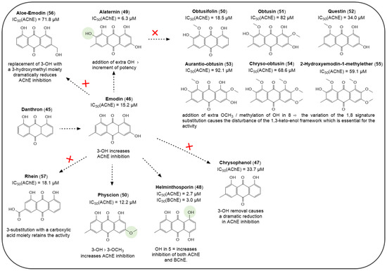 Representative AQs as ChEs inhibitors; x symbol indicates the negative impact on the activity exerted by some substitutions in a few emodin analogues.