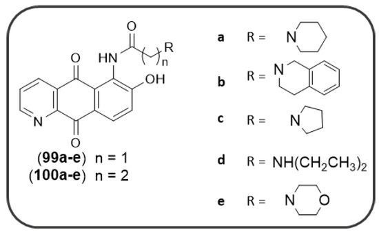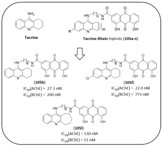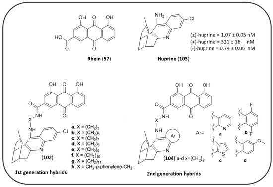 In this context, the NQ scaffold was included in three different types of hybrid molecules (Figure 9 and Figure 10). In two of them, the NQ nucleus was combined with the structure of tacrine, which was the first marketed AChE inhibitor for AD therapy, and withdrawn from use in 2013 due to its hepatotoxicity [129]. Despite this, tacrine continues to be used as a template for the design of new safer analogues against AD [130].