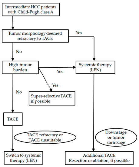 The up-to seven criteria were defined as the sum of the maximum tumor diameter in the liver (cm) and the number of tumors and they were originally developed for liver transplantation [72]. In patients exceeding the up-to seven criteria, TACE treatment was reported to be likely to worsen the liver function, which may result in missing the chance to receive MTA treatment [73,74]. The proof of concept study demonstrated that, among intermediate stage HCC patients who exceeded the up-to seven criteria, the lenvatinib group had a higher ORR and longer PFS and OS than the TACE group [75]. When the ALBI scores at baseline and at the end of treatment were compared, the ALBI score was sustained in the lenvatinib group, while it worsened in the TACE group [75]. The results of this study demonstrated that lenvatinib is superior to TACE in intermediate stage HCC patients exceeding the up-to seven criteria. The Asia-Pacific Primary Liver Cancer Expert (APPLE) Consensus Statement proposed that the TACE unsuitability should be defined by the following characteristics: (1) unlikely to respond to TACE (confluent multinodular type, massive or infiltrative type, simple nodular type with extranodular growth, poorly differentiated type, intrahepatic multiple disseminated nodules, or sarcomatous changes after TACE); (2) likely to develop TACE failure/refractoriness (exceeding the up-to seven criteria); and, (3) likely to become Child-Pugh B or C after TACE (exceeding the up-to seven criteria and mALBI grade 2b) [76]. The AASLD Consensus Conference showed that locoregional TACE may still be best approach when patients have a low tumor burden and nodules accessible super-selectively [77]. In contrast, upfront systemic therapy may be better for the patients exceeding the up-to seven criteria [77].
