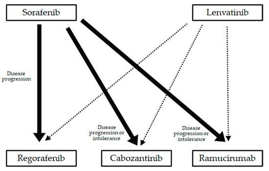 A question remains whether patients who receive lenvatinib or those who receive sorafenib as first-line treatment have a better likelihood for receiving post-progression treatment. A comparative study using propensity score matching reported that lenvatinib-treated patients showed a maintained or improved Child-Pugh score at four weeks or 12 weeks in comparison to sorafenib-treated patients, and worse Child-Pugh score at four weeks contributed to unfavorable OS [88]. Another study showed that the percentage of patients who received secondary treatment in the lenvatinib group was lower than that in the sorafenib group [89]. The post-hoc analysis of a phase 3 study showed that the frequency of receiving anticancer medication did not differ to a statistically significant extent between lenvatinib- and sorafenib-treated patients [82]. Accordingly, no conclusive findings can be drawn from these previous studies.