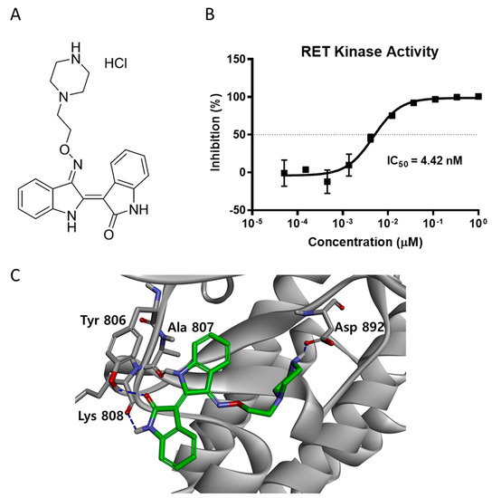 Compounds containing an indirubin core skeleton have been reported to inhibit kinases. Various kinases are affected by indirubin derivatives, depending on the chemical modification of the indirubin core skeleton. Kinases inhibited by these derivatives include glycogen synthase kinase 3β, cyclin-dependent kinase, dual-specificity tyrosine phosphorylation-regulated kinase, and Aurora kinases [12,13,14,15]. Our group also previously reported indirubin 3′-oxime derivatives as potent CDK2 and FMS-like tyrosine kinase 3 (FLT3) inhibitors [16,17]. These characteristics of indirubin-3′-oxime derivatives and their function as kinase inhibitors led us to evaluate their RET-inhibitory function. This study describes the characterization of the indirubin-3′-oxime compound LDD-2633 as a potent and novel RET inhibitor with in vitro and in vivo anti-tumor functions.