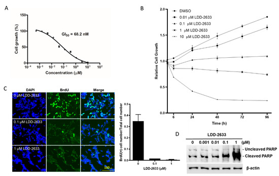 The effects of LDD-2633 on cell proliferation were determined using BrdU incorporation assay (Figure 2C). Cells in the S phase were labeled with BrdU and incorporated BrdU was visualized using immunofluorescence. BrdU- and DAPI-stained cells were counted and the ratio was calculated. Treatment with LDD-2633 strongly reduced the number of BrdU-positive cells, indicating decreased cell proliferation by LDD-2633. A reduction of 95.2% and 98.4% in BrdU-positive cell population was observed by 0.1 µM and 1 µM LDD-2633, respectively.