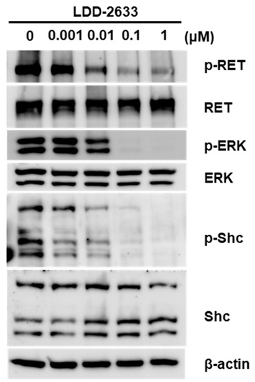 To examine the effects of LDD-2633 on the RET signaling pathway in TT cells, Western blotting analyses for RET and the downstream effectors were performed. The phosphorylation level of RET kinase was measured using an antibody specific to the phosphorylated RET (p-RET) protein. Dose-dependent downregulation of p-RET was observed upon treatment with LDD-2633 (Figure 3). The phosphorylation of Shc and ERK1/2, which are downstream molecules of RET, also decreased upon treatment with LDD-2633 (Figure 3). These results confirmed the inhibition of RET activity by LDD-2633.