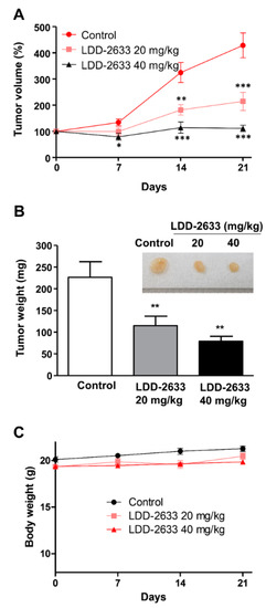 The in vivo anti-tumor effects of LDD-2633 were examined using tumor xenografts, generated in athymic mice via TT cell inoculation. LDD-2633 and PBS control were administered by oral gavage. Tumor size was measured for 21 days after starting drug treatment. As shown in Figure 4, LDD-2633 suppressed tumor growth in a dose-dependent manner. At a dose of 40 mg/kg of LDD-2633, tumor volume did not increase during the drug treatment period. Tumor weights recorded on day 21 also indicated that LDD-2633 induced tumor growth suppression. The results showed that the average tumor weights in the 20 mg/kg LDD-2633 and 40 mg/kg LDD-2633 groups were 50.1% and 34.8%, respectively, of those in the control group (Figure 4B). The body weight of each mouse was measured to determine the toxicity of LDD-2633 and was found to remain unchanged over the course of treatments (Figure 4C). These in vivo anti-tumor effects indicated the potential of LDD-2633 as a candidate for the development of thyroid cancer therapy.