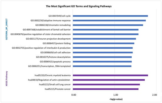 In biological process (PB) category, Gene Ontology (GO) analysis annotated the DEGs to terms (p < 0.05) associated with cell cycle, adaptive immune response, chromatin remodeling, positive regulation of sister chromatid cohesion, protein folding, positive regulation of interleukin-6 production, cell–cell adhesion, apoptotic process, transcription/DNA-templated, etc. (Figure 1). Pathway enrichment analysis of the DEGs identified the following Kyoto Encyclopedia of Genes and Genomes (KEGG) signaling pathways (p < 0.05): chronic myeloid leukemia, regulation of actin cytoskeleton, small cell lung cancer and prostate cancer (Figure 1). The list of the DEGs involved in individual GO terms/KEGG pathways and detailed parameters are available in Table S2.