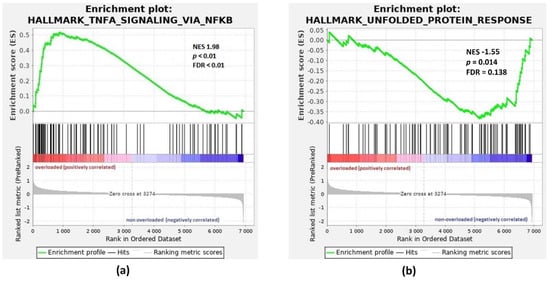 GSEA enrichment plots for Hallmark gene sets: TNFA Signaling via NF-κB and Unfolded Protein Response. Genes involved in (a) HALLMARK TNFA Signaling via NF-κB and (b) HALLMARK Unfolded Protein Response show significant enrichment in iron-overloaded patients (overloaded) versus patients with normal ferritin levels (non-overloaded). Top, the running enrichment score for the gene set as the analysis walks along the ranked list; bottom, the plot of the ranked list of all genes. X-axis, the rank for all genes; Y-axis, value of the ranking metric. ES, enrichment score; NES, normalized enrichment score; FDR, false discovery rate.