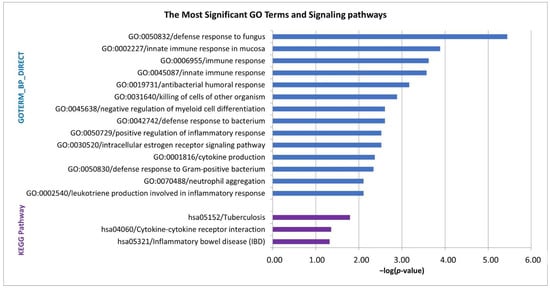 Gene Ontology analysis of the DEGs revealed a highly significant enrichment for biological processes linked with immune response (e.g., innate immune response and innate immune response in mucosa), defense response (e.g., defense response to fungus and defense response to bacterium), negative regulation of myeloid cell differentiation, cytokine production, neutrophil aggregation, positive regulation of inflammatory response and leukotriene production involved in inflammatory response (p < 0.01). The significantly enriched KEGG pathways were tuberculosis, cytokine-cytokine receptor interaction and Inflammatory bowel disease (p < 0.05) (Figure 3). The list of the DEGs involved in individual GO terms/KEGG pathways and detailed parameters are available in Table S5.