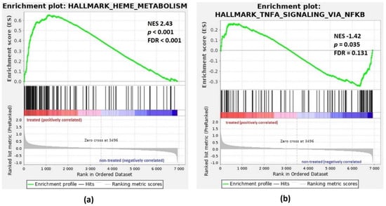GSEA enrichment plots for Hallmark gene sets: Heme Metabolism and TNFA Signaling via NF-κB. Genes involved in (a) HALLMARK Heme Metabolism and (b) HALLMARK TNFA Signaling via NF-κB show significant enrichment in iron-chelated patients (treated) versus untreated patients with iron overload (non-treated). Top, the running enrichment score for the gene set as the analysis walks along the ranked list; bottom, the plot of the ranked list of all genes. X-axis, the rank for all genes; Y-axis, value of the ranking metric. ES, enrichment score; NES, normalized enrichment score; FDR, false discovery rate.