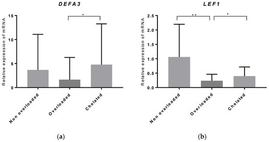 Real-time qPCR (RT-qPCR) was used for validating the microarray data of two highly differentially regulated genes (defensin alpha 3 (DEFA3) and lymphoid enhancer-binding factor-1 (LEF1)) in a large cohort of 82 patients (non-overloaded patients: n = 20; iron-overloaded patients: n = 28; and iron-chelated patients: n = 34). Significant upregulation of DEFA3 (p < 0.05) was confirmed in iron-chelated patients compared to iron-overloaded patients. In agreement with the array data, LEF1 showed significantly decreased expression (p < 0.01) in iron-overloaded patients compared to those without IO, and its expression increased (p < 0.05) in iron-chelated patients (Figure 5).