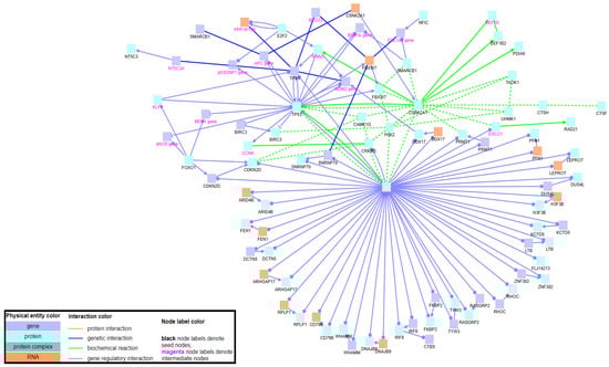 Induced network module analysis of the DEGs generated using ConsensusPathDB by considering the genetic interactions, biochemical interactions and gene regulatory interactions with intermediate genes. Nodes with black labels are seed genes, while nodes with magenta labels are intermediate nodes. Blue boxes indicate genes, light blue boxes indicate proteins and orange boxes indicate RNAs. Blue interaction lines indicate genetic interactions, green interaction lines indicate biochemical interactions and light blue interaction lines indicate gene regulatory interactions.