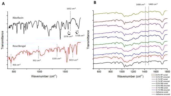 FTIR spectra of (A) riboflavin (black spectrum) and Rose Bengal (red spectrum) powder. Characteristic peaks at 1576 cm−1, 1652 cm−1, and 1728 cm−1 are noted. The spectrum at 1728 cm−1 indicates C=O stretching frequency of riboflavin. In the components, the aromatic C=C stretching mode of riboflavin appears at 1576 cm−1 and 1652 cm−1 (indicated with pointers). Rose-Bengal possesses important peaks at 456 cm−1 which indicates C–I bonding, at 952 cm−1 for C–C stretching vibration, and 1335 cm−1 and 1613 cm−1 for C=C stretching vibration and C=O stretching vibration, respectively. (B) After incorporating these powders in orthodontic adhesives, the ascribed peaks were evident forming strong bonds with the resin matrix.