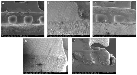 Representative SEM images of bracket-resin interface depicting excellent bonding of tooth surface with (A) Transbond XT (control); (B) 0.1% RB-PDT adhesive; (C) 0.1% RF-PDT adhesive; and (D) 0.5% RB-PDT adhesive; but (E) 0.5% RF-PDT adhesive, showed slightly poor bonding with defective adhesive within the mesh of the bracket.