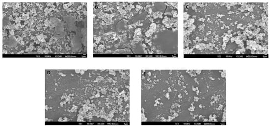 SEM micrographs showing growth of Streptococcus mutans over the surface of different modified adhesives used (A) Transbond XT (control); (B) 0.1% RB-PDT adhesive; (C) 0.1% RF-PDT adhesive showed low growth of S. mutans, Whereas (D) 0.5% RB-PDT adhesive and (E) 0.5% RF-PDT adhesive showed a substantial decrease in the microbial content of S.mutans.
