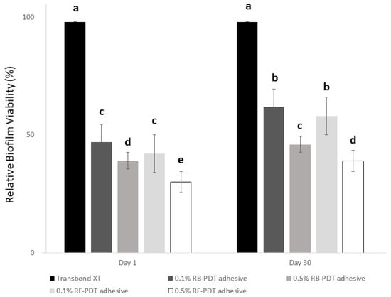 The relative biofilm viability expressed in percentage after Day 1 of incubation of S. mutans on experimental adhesives of 10 groups (5 for Day 1 groups, and 5 for Day 30 groups). The data are expressed as means and SD, groups with the dissimilar letters are statistically significant (p < 0.05).