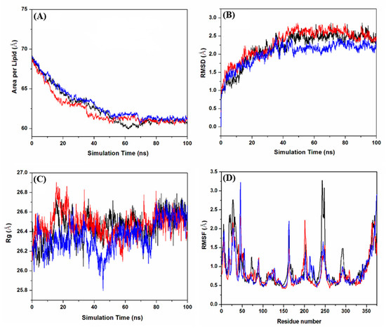 Equilibrium properties of GPER–ligand systems through molecular dynamics (MD) simulations. (A) Area per lipid values; (B) root mean square deviation (RMSD); (C) radius of gyration (Rg); (D) root mean square fluctuation (RMSF) for GPER-4 (red), GPER-5 (blue) and GPER-7 (black).