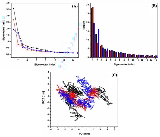 Projection of the GPER–ligand complexes in phase space. (A) The first 15 eigenvectors of the covariance matrix for GPER-4 (red), GPER-5 (blue) and GPER-7 (black). (B) The percentage of each eigenvector from panel A. (C) Projection of the motion in the phase space along the first and second eigenvectors (principal component (PC) 1 vs. PC2) for GPER-4 (red), GPER-5 (blue) and GPER-7 (black).