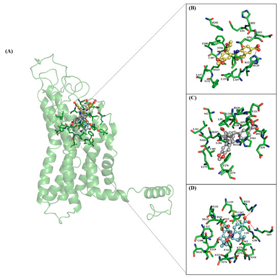 It is important to note that the pivotal residues (phenylalanine cluster and N310) were not found at the same time to be involved in nonbonding interactions with the ligands during the first docking recognition study, although it is well known that GPER contains more than one binding site formed by residues of the same chemical nature as an orthosteric binding site [20]. The resulting binding pose of the ligands obtained from the docking on GPER (for an atomistic depiction please see the Figure S1 in Supplementary Material) were employed as input coordinates for MD simulations combined with energetic calculations using the MMGBSA approach. In addition, the ligands showed acceptable physicochemical and toxicological–biological properties (absorption, distribution, metabolism, excretion and toxicity (ADME-tox)) according to Lipinski’s rules, which are the parameters required for new drug design (see Table 2). Toxicological–biological evaluations showed no effect on any property analyzed.