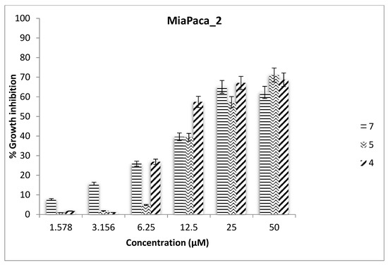 Growth inhibitory activities of 4, 5 and 7 on the MIA Paca-2 cancer cell line. The results are expressed as the mean of three individual experiments; p < 0.05.