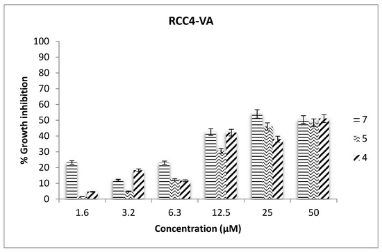 Growth inhibitory activities of 4, 5 and 7 on the RCC4-VA cancer cell line. The results are expressed as the mean of three individual experiments; p < 0.05.