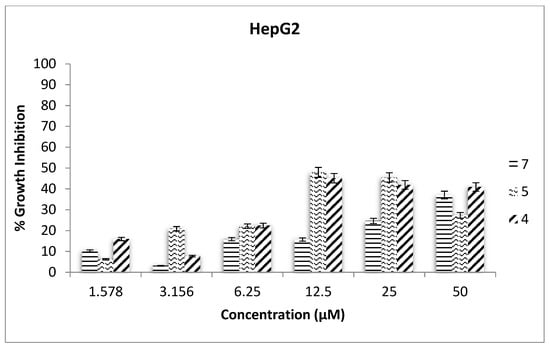 Growth inhibitory activities of 4, 5 and 7 on the Hep G2 cancer cell line. The results are expressed as the mean of three individual experiments; p < 0.05.