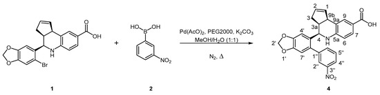 3.8.2. Synthesis of (3aS, 4R, 9bR)-4-(6-(3-Nitrophenyl)benzo[d][1,3]dioxol-5-yl)-3a,4,5,9b-tetrahydro-3H-cyclopenta[c]quinoline-8-carboxylic acid, 4