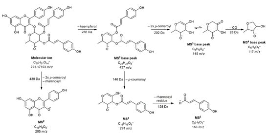 By analyzing flavonoids, compounds from the subgroup of flavonols and flavones were found. Only two aglycones were detected, luteolin (compound 24) and apigenin (compound 26) and both compounds have already been confirmed as constituents of Anthriscus sylvestris Hoffm. (Apiaceae) []. The most common compounds were flavonol glycosides with a p-coumaroyl residue. Almost all such compounds showed specific fragmentation where the mass of deprotected aglycone does not appear as MS2 base peak, but it is formed by loss of mass of aglycone. Thus, for example, compound 31 at 11.54 min and 723 m/z generated MS2 base peak at 437 m/z, which corresponds to the fragment resulting from kaempferol loss [M–H–286]−, while the secondary MS2 peak was found at 285 m/z (deprotonated kaempferol). Further, MS3 fragmentation gave a base peak at 145 m/z (loss of two p-coumaroyl residues) and secondary peaks at 291 and 163 m/z (Figure 1). Based on all these findings, a given compound is presumed to be kaempferol 3-O-(2″,3″-di-p-coumaroyl)-rhamnoside, which was previously isolated from the flowers of Foeniculum vulgare Mill. and Foeniculum dulce DC. (Apiaceae) [].