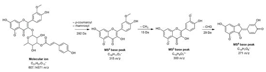 Proposed fragmentation pattern of compound 28 (isorhamnetin 3-O-(3″-p-coumaroyl)-rhamnoside).